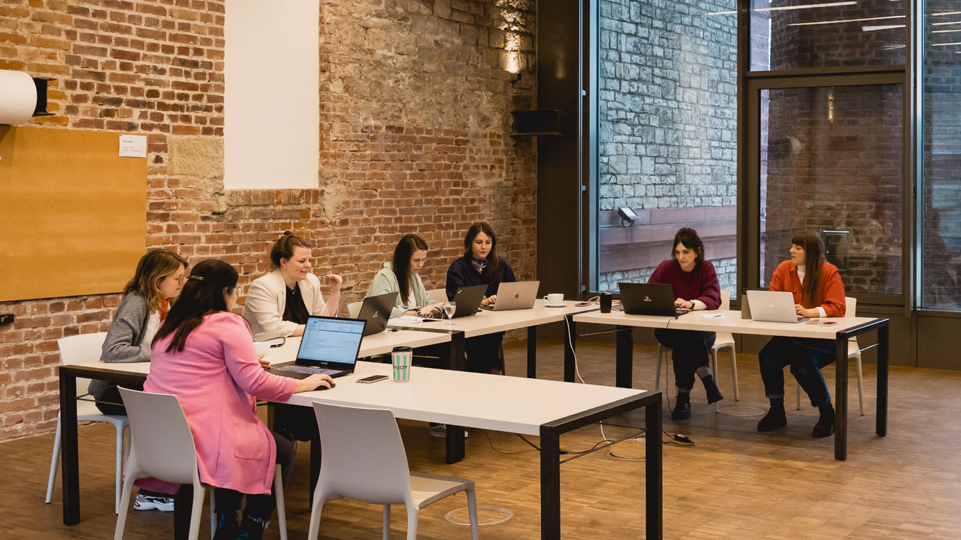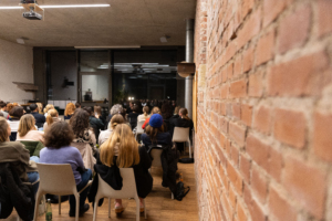 Du sitzt in Stuhlreihen hintereinander, vor dir Tische. Typisch für produktive Tagungen und Konferenzen mit viel Platz für Mitschriften und Notizen.